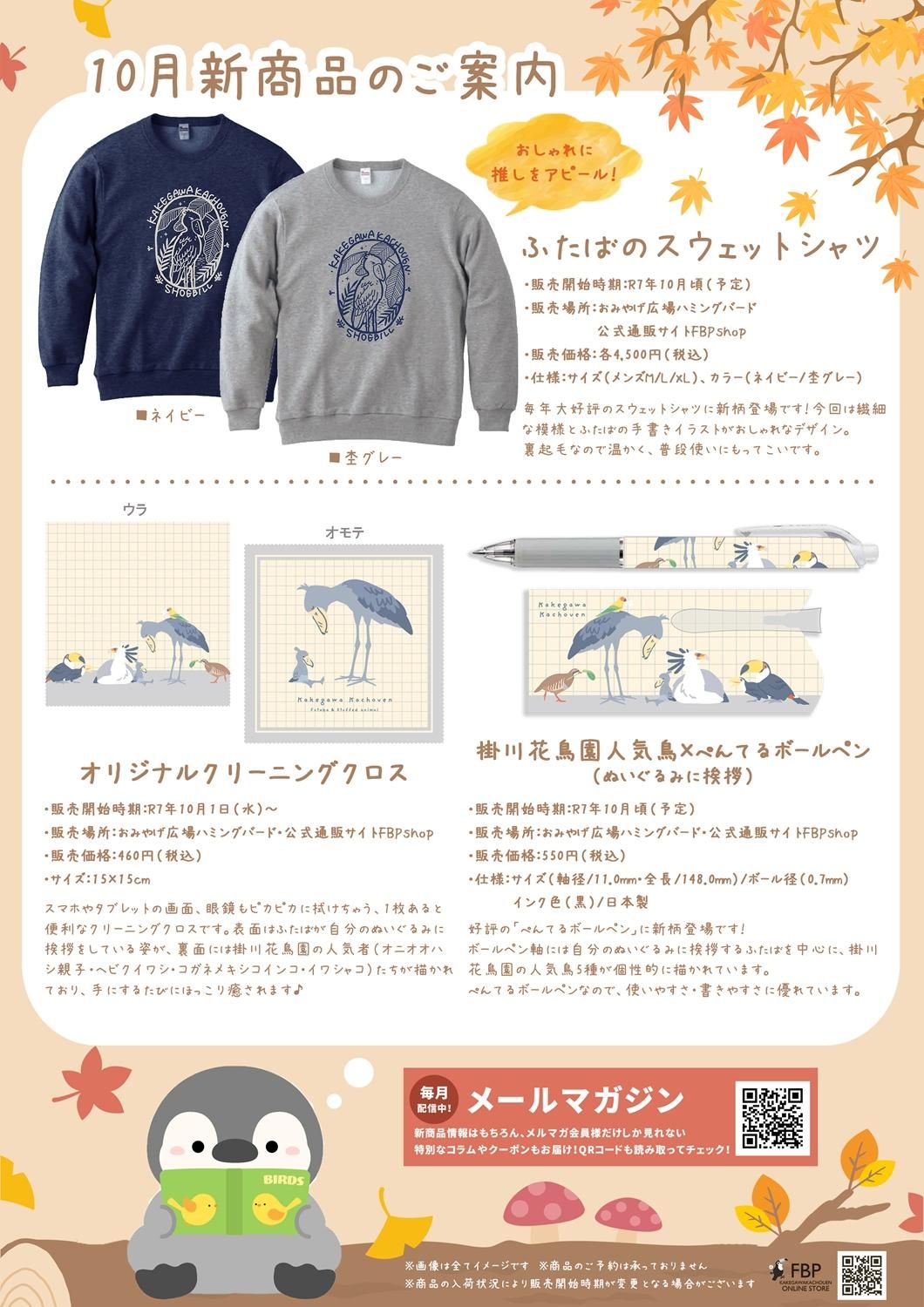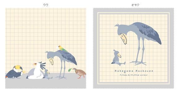 スマホやタブレットの画面、眼鏡もピカピカに拭けちゃう、1枚あると便利なクリーニングクロスです。表面はふたばが自分のぬいぐるみに挨拶している姿が、裏面には掛川花鳥園の人気者(オニオオハシ親子・ヘビクイワシ・コガネメキシコインコ・イワシャコ・ハシビロコウふたば)達が描かれており、手にするたびにほっこり癒されます♪