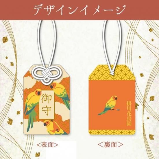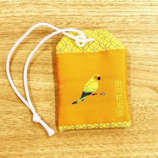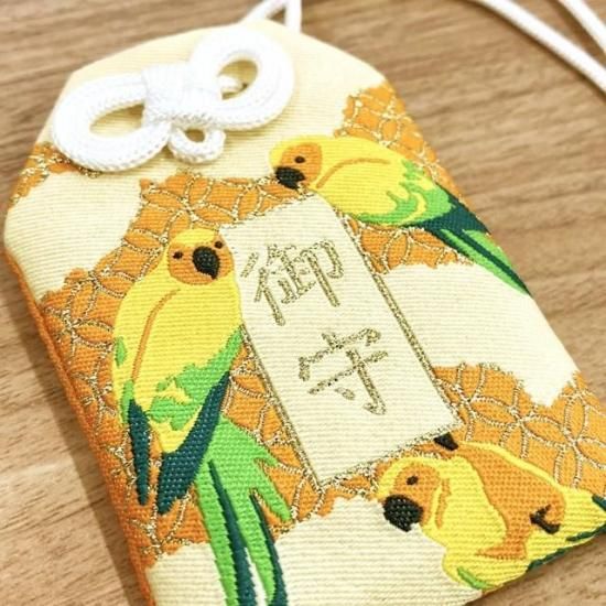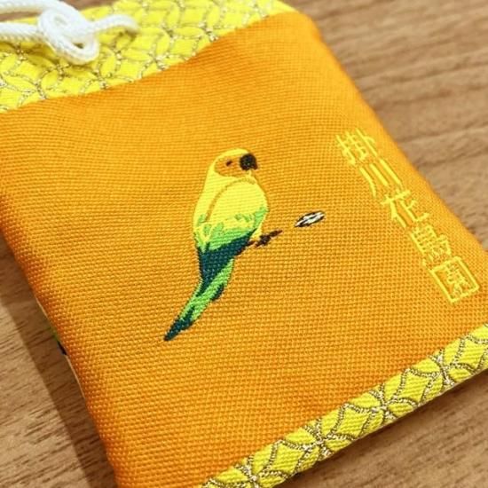 こちらは、「コガネメキシコインコたちがお守り袋をかじっていたずらしている」様子がおもしろかわいいデザインです。